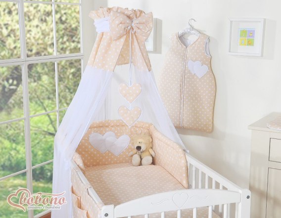 Bobono Baldachim z tiulu- Serduszka białe grochy na beżu