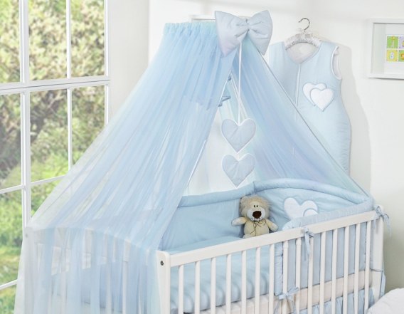 • Bobono Duża moskitiera do łóżeczka dziecięcego z szyfonu z wiszącymi serduszkami i kokardką - niebieska