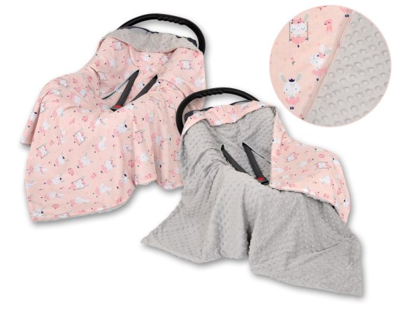 Bobono Duży otulacz dla niemowląt do fotelika nosidełka wózka dwustronny - króliczki baletnice różowe/szary