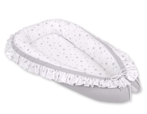 • Bobono Kokon/kojec niemowlęcy z falbanką - mini gwiazdki szare na białym tle/szary