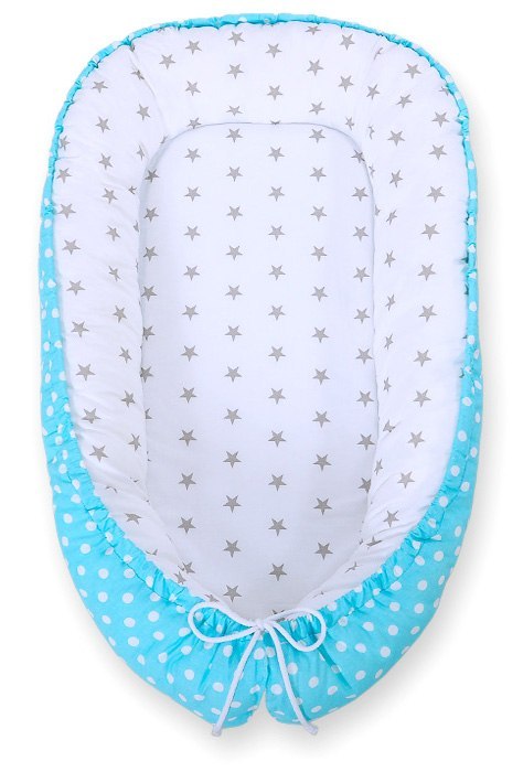 Bobono Kokon niemowlęcy dwustronny kojec otulacz Premium BOBONO- szare gwiazdki/ groszki na turkusie