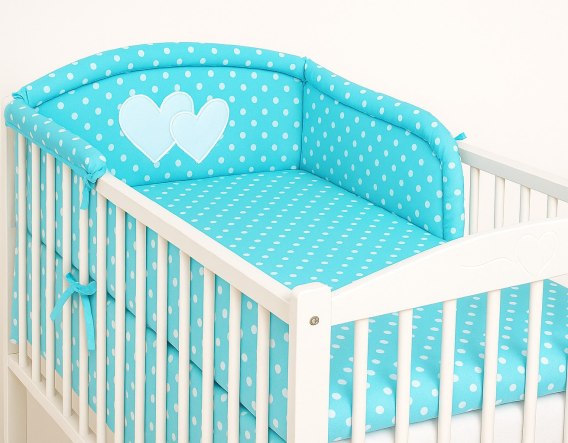 • Bobono Ochraniacz do łóżeczka na szczebelki uniwersalny - Serduszka białe grochy na turkusie
