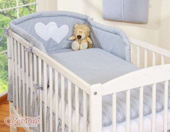 3.Ochraniacz uniwersalny zaokrąglony 35x188cm.Wysoki i sprężystyochraniacz doskonale amortyzuje i ochroni Twoje Maleństwo przed twardymi szczebelkami łóżeczka. Specjalnie skonstruowany i z dodatkowymi przeszyciami, tak by idealnie pasował zarówno na łóżeczko 120x60 cm, jak i na większe łóżeczko-tapczanik 140x70 cm, będzie więc wam dłużej służył. Zagłówek ozdobiony dużymi aplikacjami serduszek, pięknie obszytymi atłasową lamówką . Ochraniacz wypełniony jest grubą warstwą sprężystej antyalergicznej włókniny silikonowej, dzięki czemu ładnie układa się na łóżeczku. Włóknina posiada certyfikat Ökotex. Ochraniacz na łóżeczko wykonany jest z najwyższej jakości bawełny, która nie spiera się, "nie mechaci" i nie traci swoich właściwości nawet po wielu praniach. Bawełniane mocne troczki umożliwiają łatwe i solidne przymocowanie ochraniacza do łóżeczka dziecięcego.