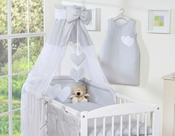 • Bobono Pościel 5-cz 120x90 z baldachimem - Wiszące Serduszka szare