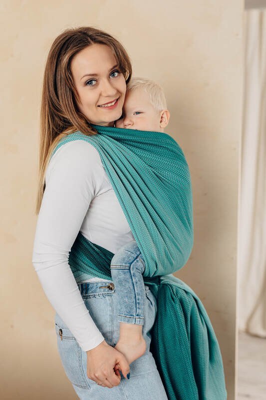 Chusta do noszenia dzieci, tkana splotem jodełkowym, bawełna - MAŁA JODEŁKA OMBRE ZIELEŃ - rozmiar S (drugi gatunek)
