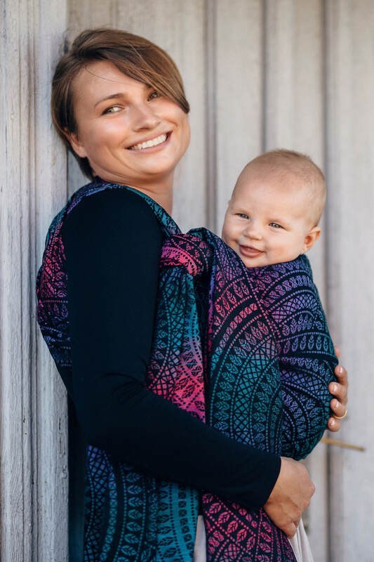 • Żakardowa chusta do noszenia dzieci, 60% bawełna, 28% wełna merino, 8% jedwab, 4% kaszmir - PAWI OGON - CZARNY OPAL - rozmiar L